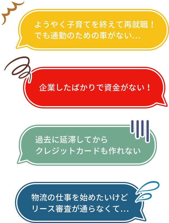 「子どもの送迎の前後で仕事場に行く」「学校を卒業したてなので、与信審査が通過しない」「物流の仕事をはじめたい」「ローン返済完了時が高齢なので、ローンが組めないと言われた」など、まじめに働く人が正しく評価される画期的なマイカーローンです。